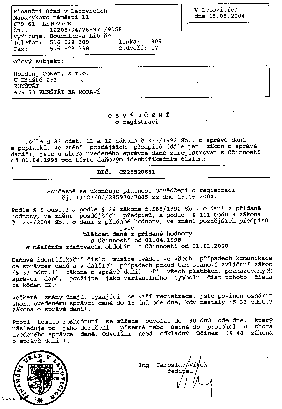 Osvědčení o registraci DPHOsvědčení o registraci DPH (gif 20 kB) je Vám k dispozici v rámci obchodních vztahů pro dokladování Vašim finančním úřadům.Dodací podmínkyV dokumentu dodací podmínky (Word 40 kB) jsou shrnuty standartní podmínky za nichž dodává Holding CoNet ® s.r.o. nabízené produkty. Smluvně lze dohodnout i podmínky odlišné. |