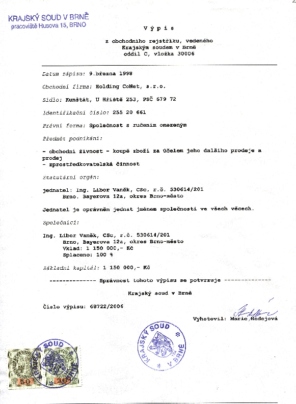 Společnost CoNet ® vznikla již v lednu 1991 s IČO 15527310 pod, kterým ji můžete najít na stránkách obchodního rejstříku http://www.justice.cz/xqw/xervlet/insl/index. V roce 1994 a pak v r. 1996 a 1998 došlo po dohodě 11 spoluvlastníků k rozdělení na společnosti specializované na jednotlivé činnosti a dodnes aktivní. Je to: TauNet s.r.o. (IČO 255 29 200 -specializace na počítačové sítě), CoNet Data Communication s.r.o. (CDC data s.r.o. IČO 253 44 609) - dnes hlavně servis počítačů Siemens, CoNet SW a.s. (IČO 253 10 453 se specializací na zakázkový SW a nyní i internetový obchod) a společnost Holding CoNet s.r.o. na jejichž stránkách se nalézáte.Výpis z obchodního rejstříkuCoNet ®dle výpisu z obchodního rejstříku (gif 90 kB) disponuje základním kapitálem 1 150 000.- Kč. K dispozici jsou i skladové zásoby, bankovní úvěry, vozidla a vlastní provozovnou s disponibilní plochou přes 500 m2 (viz obrázek v záhlaví). Hlavní činnost dnes nevyvíjí z oficiálního sídla v Kunštátě na Moravě, ale z brněnské provozovny na adrese:Holding CoNet ® s.r.o. Úprkova 2a, 621 00 Brno |